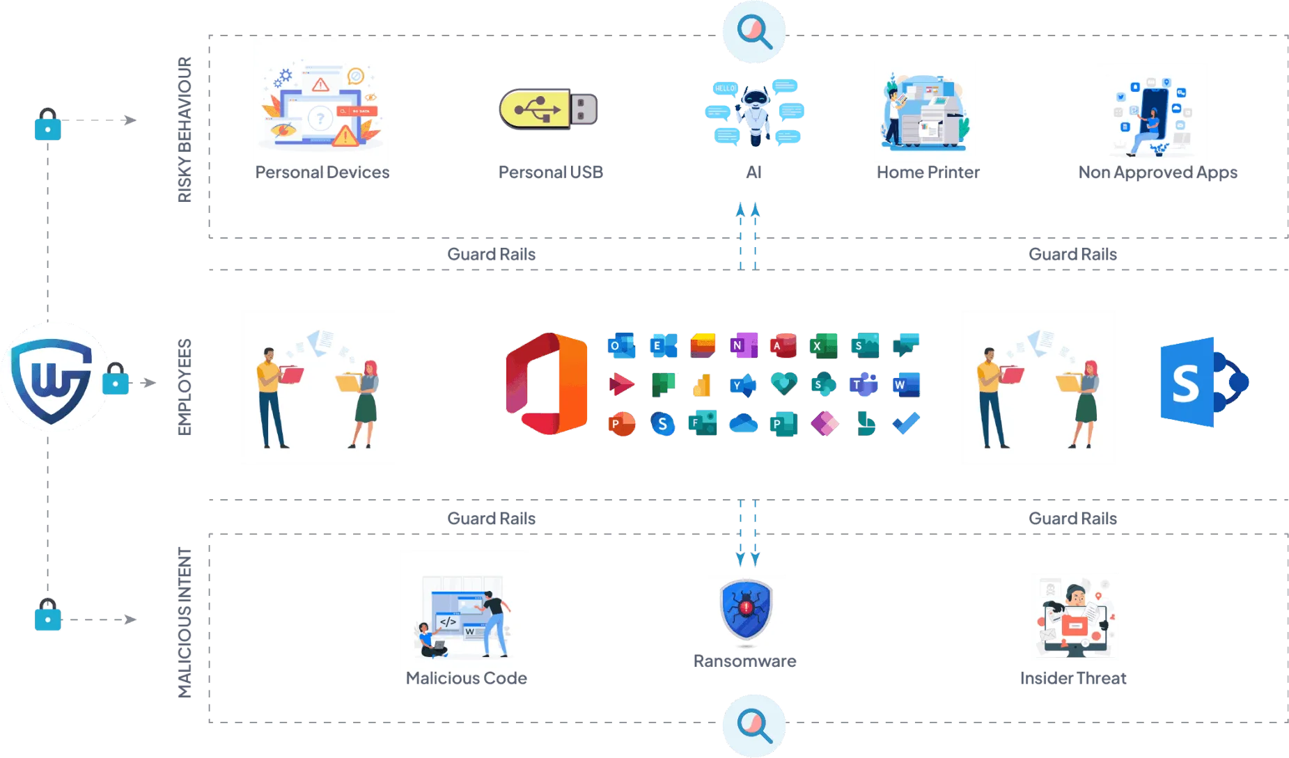 No. We start monitor-only to map behaviour, then phase in policy (warn → enforce) where it won’t block the work. GuardWare integrates with M365/SharePoint, file shares, email, CAD/PLM and common OT hand-offs, so teams keep their tools while you gain control and visibility.